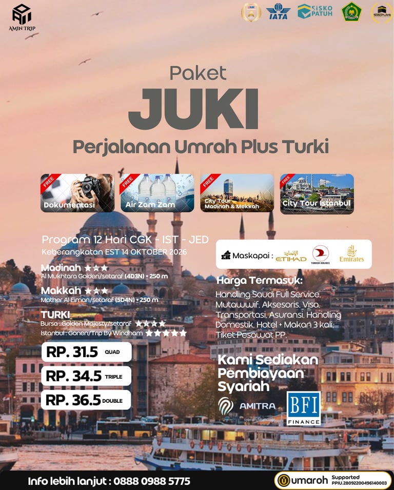 Amin Trip menghadirkan perjalanan umroh yang aman, nyaman, dan penuh kepastian. Kami bekerja sama dengan Umaroh, mitra resmi yang telah terdaftar sebagai PPIU (Penyelenggara Perjalanan Ibadah Umrah) nomor 28092200496140003 a.n PT. Nawaitul Umrah Haji dengan Akreditasi A, yang sudah pengalaman memberangkatkan ribuan jamaah secara profesional tanpa kasus gagal berangkat.